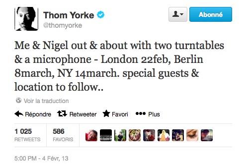 Thom Yorke et Nigel Godrich assurent ensemble un concert d’1h40 comprenant tous les titres d’AMOK sauf « Reverse Running » + Harrowdown Hill (Thom à la basse), Atoms for Peace, Black Swan et the Eraser de The Eraser.