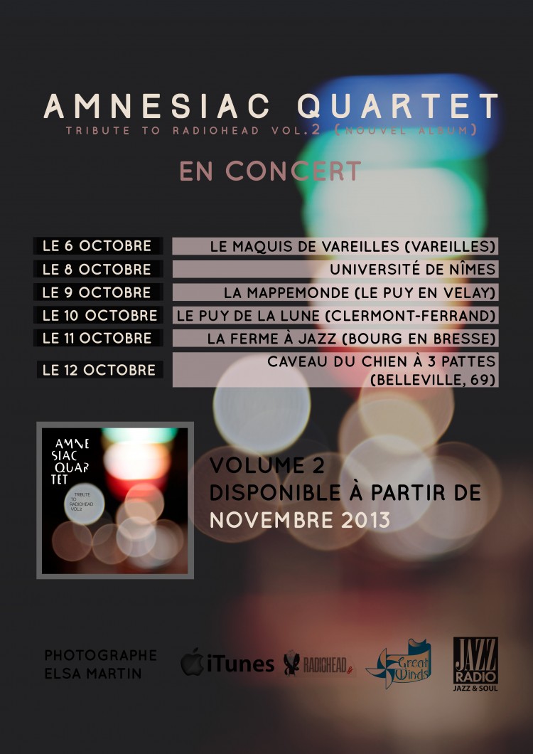 Vous êtes plusieurs à avoir donné un coup de pouce à Amnesiac Quartet pour leur projet de CD “Tribute to Radiohead vol.2″…et vous êtes peut-être de ceux qui ont fait avec plaisir la connaissance de Sébastien en juillet…vous aimez le jazz…vous êtes de passage dans la région: que de bonnes raisons d’aller les écouter en live!