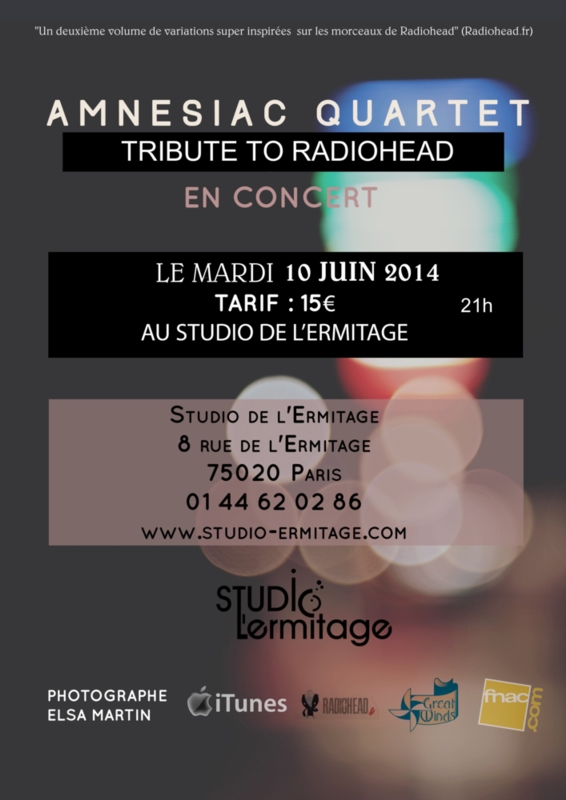 Un nouveau concert de l’Amnesiac Quartet, seul groupe de jazz dédié à la musique de Radiohead, revisitée, réorchestrée, source d’inspiration infinie, est programmé au Studio Ermitage, dans le 20ème arrondissement à Paris. Ce sera mardi 10 juin à 20h30: qu’on se le dise!