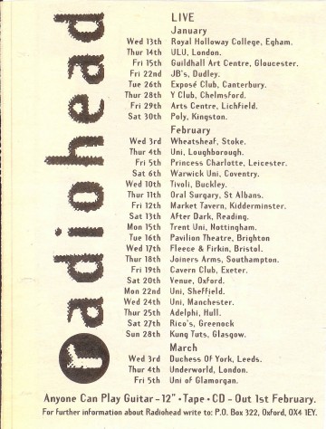 Tournée Anyone Can Play Guitar (13 janvier – 14 mars) Selon des reviews laissées sur le site greenplastic : http://www.greenplastic.com/gigography/showDetails.php?showID=87 – deux groupes jouaient avec / avant Radiohead : Instant Dog et Coloryde. – “There was a review for this gig in one of the free guitar magazines that said