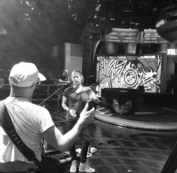 Hier soir, 25 septembre, Jon Stewart recevait dans son émission, the Daily Show, Atoms for Peace, pour la 1ère fois à la télévision tous ensemble: une petite interview où Thom et Flea ont rivalisé d’admiration mutuelle (Jay-Z et Beyoncé? ils sont très choux!), avant de se lancer dans Default et