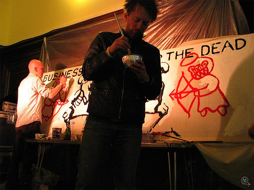 Thom, en refaisant la déco de la chambre de ses enfants, les a enfin débarrassés de cette tenture qu’il avait commise avec Stanley Donwood lors des manifestations du Trade Justice Mouvement en 2005. L’oeuvre en question, entièrement peinte à la main lors d’une mémorable soirée d’action, est mise aux enchères au bénéfice du mouvement: généreux, hein?