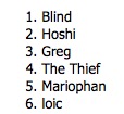 Et les 5 gagnants sont (et juste pour le fun, j’ai laissé le nom du 6ème…) :