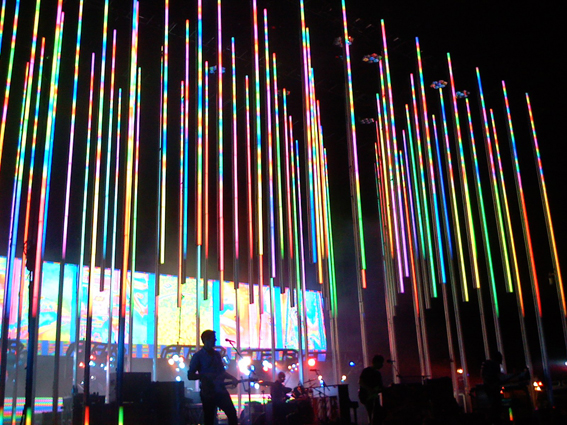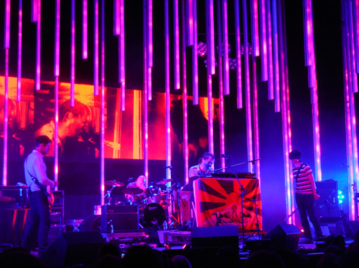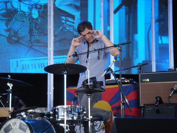 19h30 : Grizzly Bear entre sur scène. Johnny Greenwood regarde le concert du coté de la scène. Le public apprécie beaucoup le set. Une fan ayant vu Radiohead 64 fois (agh !!) vient féliciter Ed et Daniel peut après leur set et leur fait partager son enthousiasme, selon elle, ils sont le meilleur groupe ayant supporté Radiohead. 20h45 : Radiohead !! .. Nous sommes dans la fosse. Devant, avec les fans, nous sommes vraiment bluffés par les lumières. Les parents de Chris Bear venu pour l’occasion aiment aussi beaucoup le concert. Dernier morceau, Thom Yorke prend la parole et remercie Grizzly Bear pour leur set.