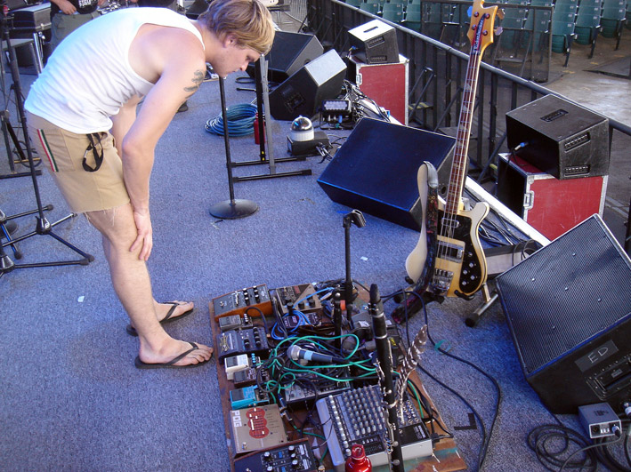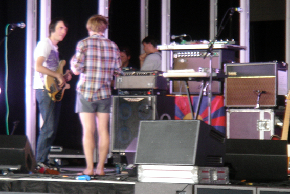 Aujourd hui, le soundcheck de Radiohead est un vrai plaisir, ils jouent deux morceaux que je ne connais pas (de nouveaux morceaux ??) un grand nombre de fois. Puis un ancien morceau que j’ai du mal à reconnaître (ce n’est pas How I Made My Millions, mais ça y ressemble. Thom est seul au piano). Backstage. La journée est très relaxante, avec des occupations très légères telles que boire de la limonade et lire allongé dans l’herbe. A la fin du soundcheck de Grizzly Bear, Colin qui les écoutait dans les gradins, les rejoint sur scène et emprunte la basse de Chris Taylor pour jouer quelques accords de Joy Division.