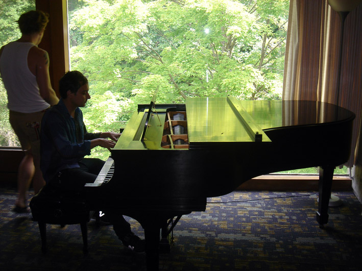 Aujourd’hui le concert a lieu dans un magnifique parc avec une scène recouverte d’un toit en bois. Les backstages sont également très agréables avec une superbe vue sur la forêt et un piano sur lequel Daniel joue une bonne partie de l’après midi. Des amis de New York nous rejoignent avec un gâteau au chocolat caché dans leur bagage qui nous aidera à célébrer l’anniversaire de Daniel un peu plus tard ce soir là . A nouveau, le public est très réceptif au set de Grizzly Bear.