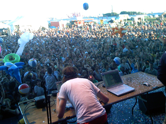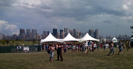 Nouveau festival sur Liberty Island, de l’autre coté de Manhattan, avec donc une vue improbable sur la ville pour le public. Depuis la scène, c’est la Statue de la Liberté que l’on voit. Assez tôt dans l’après midi, une dizaine d’amis du groupe qui ont pris le ferry depuis New York nous rejoint. Ca sera donc une journée festive. Grizzly Bear jouent assez tôt vers 17h. Une fois le set passé, il est temps de s’amuser. Je vois la fin du set de CSS, très divertissant comme toujours, et encore plus avec leurs nouvelles danseuses aux tenues très colorées. A la fin de leur set, alors que je parle avec Lovefoxx, Chris Bear m’attrape au passage pour que je le rejoigne avec une trentaine d’autres personnes pour être sur scène pour danser derrière Girl Talk. Qui peut faire un mash up mixant Cindy Lauper et Lil Wayne avant tant de classe ? Avec en plus des ballons de plage, crocodiles gonflables et confettis en grande quantité, le public en redemande !