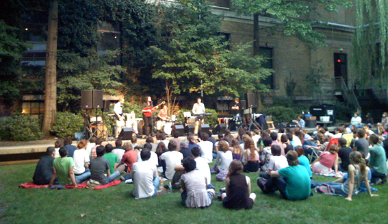 A 15h, alors que tous les instruments sont installés sur scène, juste avant de commencer le soundcheck, la pluie vient perturber nos plans. Nous recouvrons vite les instruments de film plastique. L’averse est rapide, mais suffisament intense pour que l’espace dans lequel le public est censé se trouver soit complétement innondé. La table de mixage est également humide. Nous pensons tout d’abord déplacer le concert dans le musée, mais avec l’aide de l’équipe du musée, nous recouvrons l’herbe du parc de carton pour que le public ne soit pas dans la boue et la table de mixage est vite séchée. Nous avons une heure de retard, mais tout semble en ordre. Le concert commencera juste un peu plus tard. Mais le concert en exterieur en vaut la peine. La première partie est assurée par le groupe Violens (de brooklyn). Ils ont aussi jouer les concerts de Williamsburg et Washington.