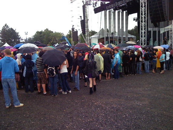 Le planning de la journée prend du retard. Radiohead commence son soundcheck, au loin je crois reconnaitre un morceau de New Order, puis Myxomatosis, et lorsque la pluie s’arrête, une fois plus proche de la scène, je peux profiter de Spinning Plates et Kid A (qui malheureusement ne sera pas dans le set ce soir là ). La journée ayant pris du retard, le soundcheck de Grizzly Bear doit être très rapide. Le groupe décide de changer son set et de commencer avec Colorado ce soir. 17h30, les portes ouvrent, les fans courent sous la pluie dans la boue pour être aux premiers rangs.