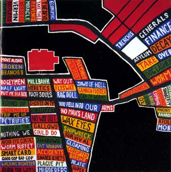 Thom : En fait, ce qu’il faut bien voir c’est que j’ai coupé toutes ces choses, ces mots et je les ai retiré délibérément de leur contexte, donc c’est un peu comme un papier peint. Et puis, lorsque j’avais besoin de mots pour les chansons, je les décollais de ce papier peint, et ils étaient donc en dehors de tout contexte politique. Et c’était en quelque sorte l’intérêt. L’intérêt c’était ce language très puissant, mais que je ne voulais pas utiliser pour dire quelque chose de déliberé, parce que ça n’aurait pas marché. Si on essaye d’écrire un truc politique c’est juste… merdique. À moins que vous ne soyez The Clash, et dans ce cas là vous vous en sortez. Mais nous on ne peut pas, et on n’en a pas l’intention.