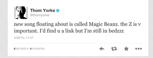 Une nouvelle chanson d’Atoms for Peace, diffusée pour la première fois le samedi 27 avril vers 23h50 dans l’émission “Le Grand Mix” de Radio Nova. La radio l’a annoncée sous le titre de Magic Beans, mais dès le lendemain, Thom Yorke a twitté que le titre était “Magic Beanz” et que le “z” était important.