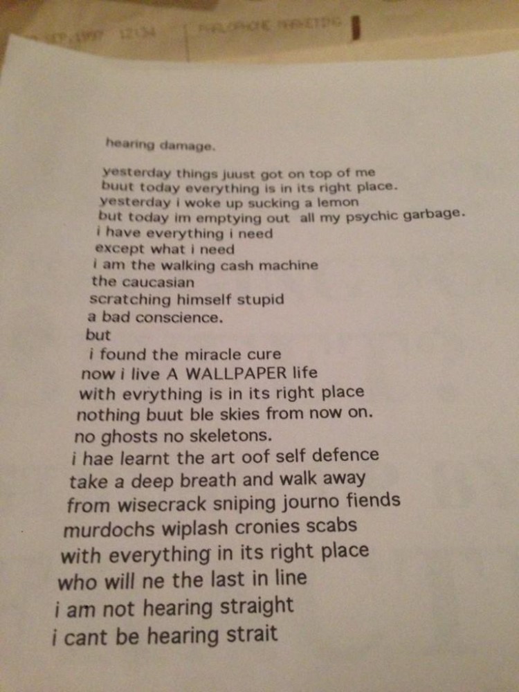 3. Thom Yorke continue à ranger ses papiers et livre sur twitter les paroles de la chanson originale qui a été dépecée pour devenir les petites phrases qui se retrouveront dans divers morceaux de Kid A et d’Amnesiac. ON dirait une chanson écrite aujourd’hui, et c’est parfaitement clair.