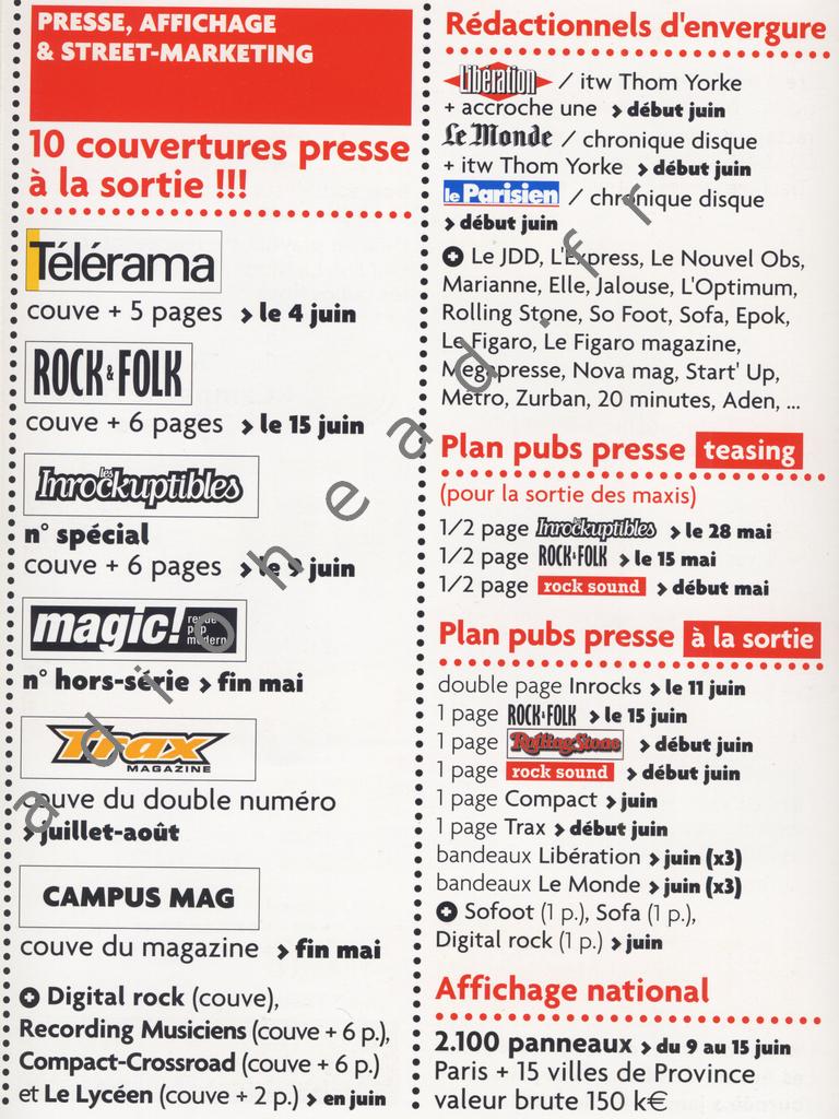 presse plan promo Hail To The Thief admin 2003-05-31 31 Mai 2003 admin 0 0 1.2k 0 à remarquer, une date était prévue en France en 2004… mais n’ a pas eu lieu, le groupe devant être fatigué de sa tournée en stades.(cliquer pour agrandir)