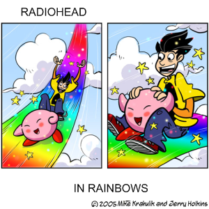 Le jeu du moment, lancé par hickdesign, est d’imaginer la pochette de ‘In Rainbows". Quelques Stanley Donwood s’y sont essayé, et voilà quelques exemples: