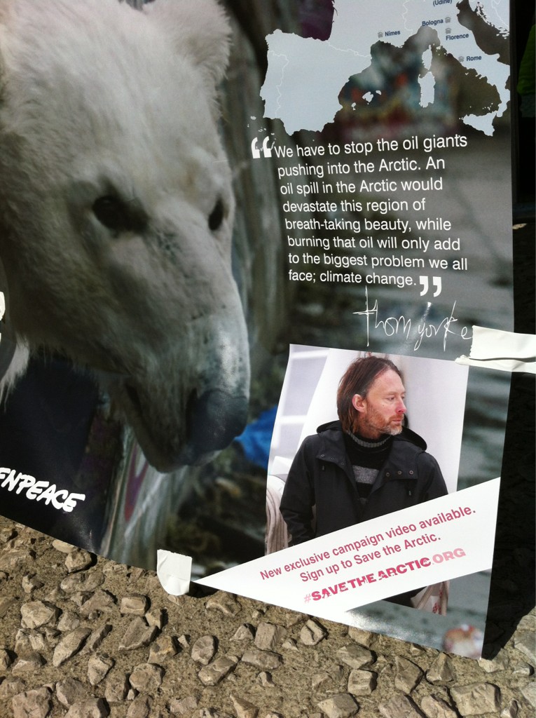 Thom relaie sur le DAS le défi de Greenpeace qu’il soutient: après avoir fait reculer Shell qui a renoncé pour l’instant à forer dans le grand nord, Greenpeace a envoyé une petite équipe d’écolos pour atteindre à pied le Pôle nord et y planter un drapeau, l’objectif étant de réclamer que l’Arctique devienne une réserve naturelle inviolable.
