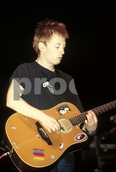 C’est une bien vieille guitare, que Thom Yorke n’a utilisée qu’au début du groupe. On la voit par exemple sur ces photos d’un set au Virgin Mega Store de Paris en novembre 1995 :