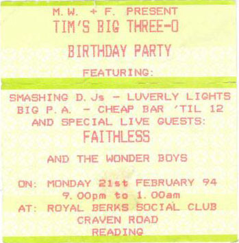 Un concert spécial avait été monté le 21 février 1994 pour fêter les 30 ans de Tim au Royal Berks Social Club, à Reading. Le groupe s’était produit sous le nom de “FAITHLESS and the wonder boys” (sûrement pour éviter que trop de fans ne viennent)