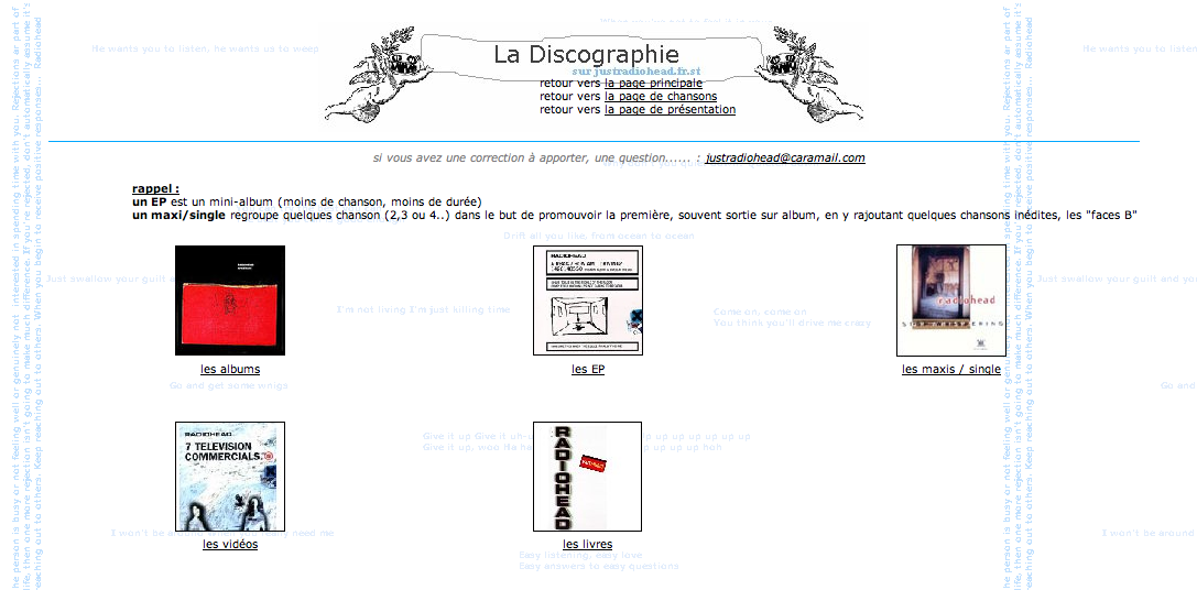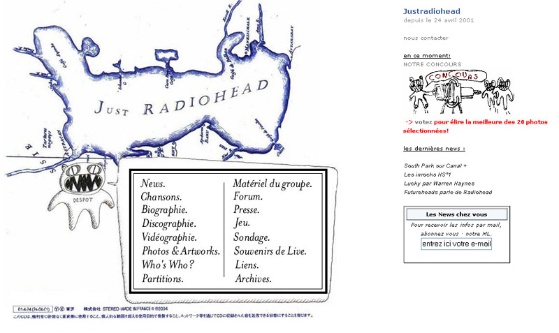 Mais voilà, un cap est franchi, le petit site qui s’appellait au départ chez.com/justradiohead,crée en partie sur caramail (ouioui je vous assure…) a bien changé, a pris de l’ampleur, l’équipe a un peu changé aussi, mais l’esprit y est, je pense : des amateurs, et non pas des fanatiques du groupe, pas de publicité (c’était notre crédo de départ, on se démerde comme on peut, on vent des badges…), un forum sympa (les mêmes membres depuis longtemps, peu mais sympas :)), de super rencontres, des concerts où l’on va ensemble, à l’arrache, bref, bah voilà, un nouveau cap est franchi, et merci à tous ceux qui nous ont apporté leur soutien, même dans les moments de doute (au gars du forum en particulier)