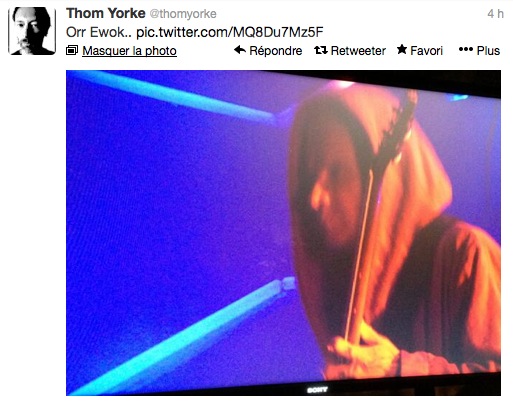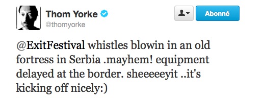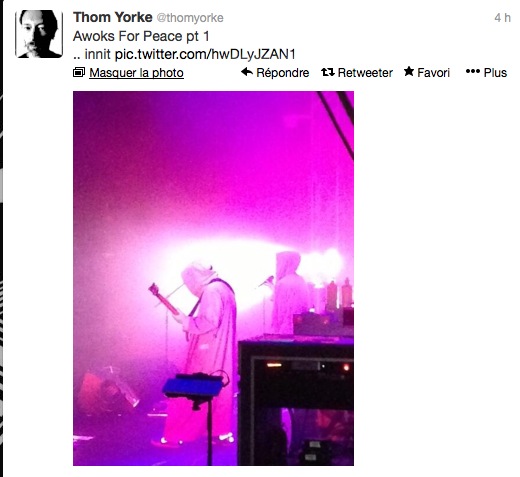 Atoms for peace était attendu sur le main stage pour minuit (l’heure du set a été un peu retardée…). Un streaming permettait aux internautes de suite en direct et en excellente qualité toutes les prestations du festival… sauf que : «Atoms For Peace will not be streamed live, due to copyright infringement, by the wish of performer»