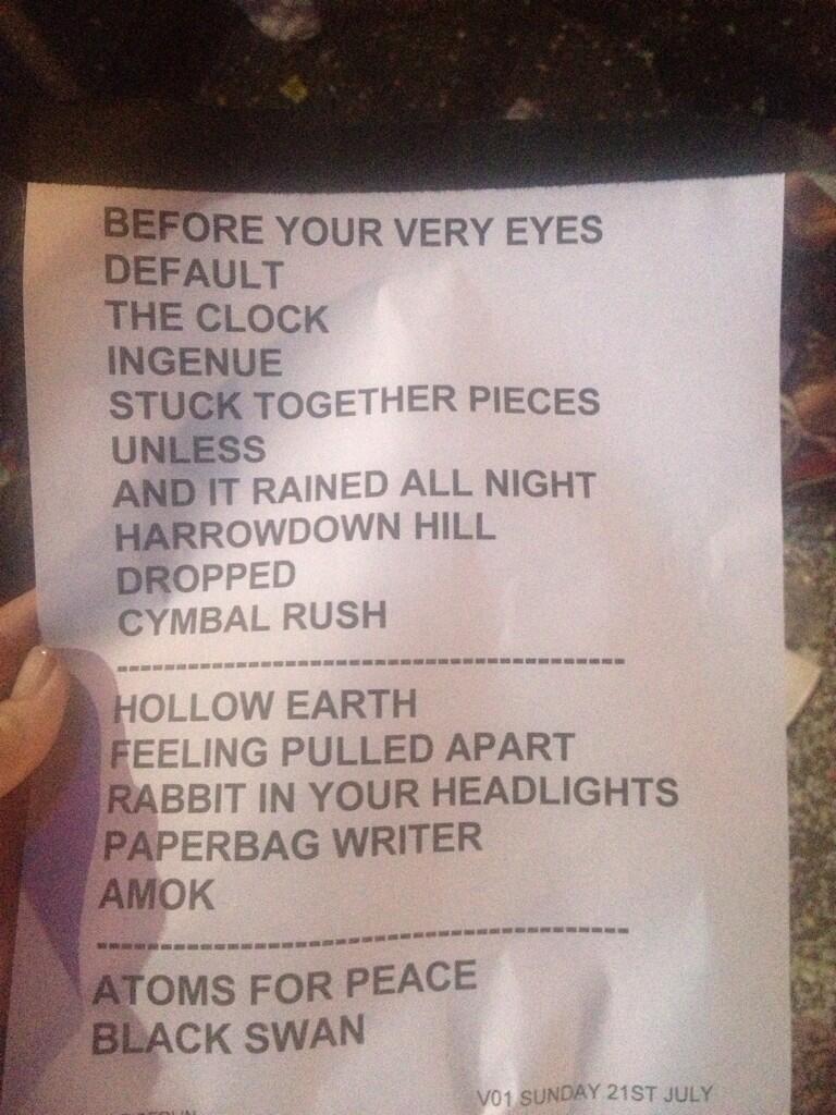 Alors que le Musikexpress fait état de problèmes techniques pendant le concert et surtout d’une grande fatigue du public épuisé après ces 3 jours de festival, les tweets de Thom Yorke, de Mauro Refosco et de Flea sont complètement enthousiasmés par Melt! et l’ambiance de ce concert: “we played out nuts orff…it was dope! ” s’exclame Thom et Flea distribue des preuves d’amour à tout le monde: “I love you Joey, Nigel, Thom, Mauro! ” tellement il est heureux d’avoir joué là ! Ils ont apparemment fait un tour par Berlin également avant de repartir pour l’Angleterre.