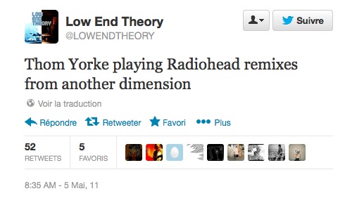 Un rapport complet de la soirée et des photos : http://latimesblogs.latimes.com/music_blog/2011/05/live-thom-yorke-flying-lotus-perform-surprise-dj-set-at-low-end-theory.html