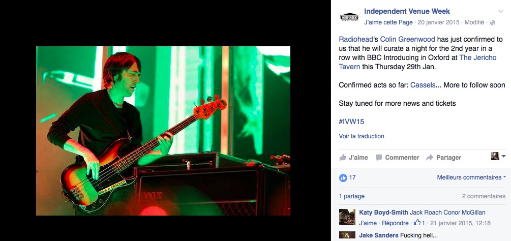 [quote cite=”Drowned in Sound, 21 janvier 2014″]Colin Greenwood: I became involved through a friend of mine, Sybil (Bell), who’s been putting together the Independent Venue Week programme for the past year. She knew that I wasn’t very busy with Radiohead at the minute and wondered whether or not I’d be up for getting involved.