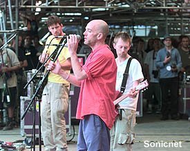 [quote cite=”NME, 27 juin 1998″ ]Thom Yorke is brought on – announced as “an ersatz Patti Smith†– to sing the backing groans on “E-Bow The Letterâ€, and at the song’s mesmeric conclusion, before “Man On The Moon†and the triumphant exit, there is a revealing moment. Stipe puts his arm around Thom Yorke and shows him the crowd in the palm of his hand. What he’s saying, one would like to think, is,†One day, my son, this will all be yours…â€[/quote]