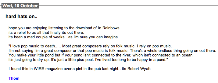 Thom a d’ailleurs posté un message sur le blog du groupe, où il cite Robert Wyatt, le batteur chanteur de soft machine : .png)