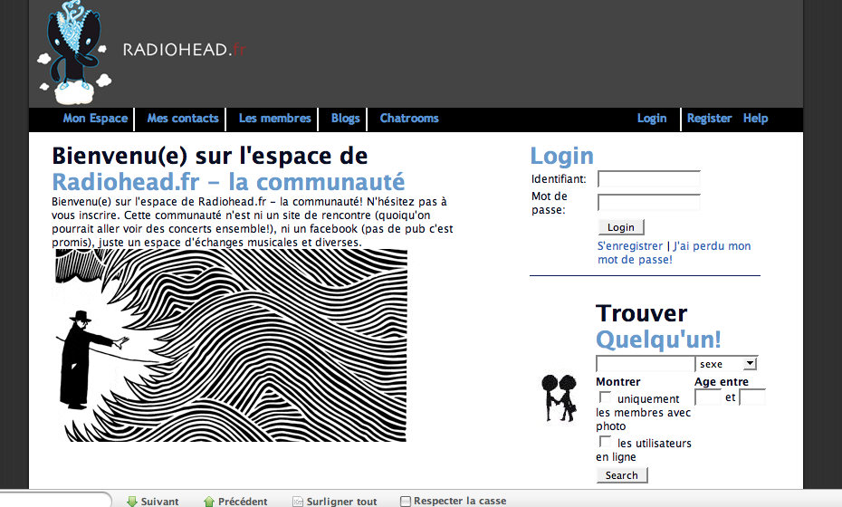 pour discuter musique, partager des revues de concerts (la partie blog peut servir à ça), faire des rencontres (il y a des concerts de radiohead dans peu, et franchement, y aller entre amateurs du groupe, c’est chouette :)), partager des bouts de vie, tout et n’importe quoi (enfin pas trop n’importe quoi hein)….