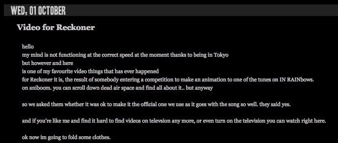 Thom Yorke, en direct de Tokyo, annonce que le clip de Clément Picon sera le clip officiel de Reckoner . Le groupe a décidé d’utiliser une des quatre vidéos finalistes du concours organisé quelques mois plus tôt Aniboom.