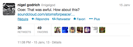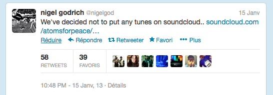 Sur Twitter, Nigel Godrich annonce que le groupe ne postera plus de lien vers des chanson d’Atoms for Peace… et en même temps donne un lien vers une page SoundCloud avec une nouvelle chanson ‘Time Was Dropped’ et une image.